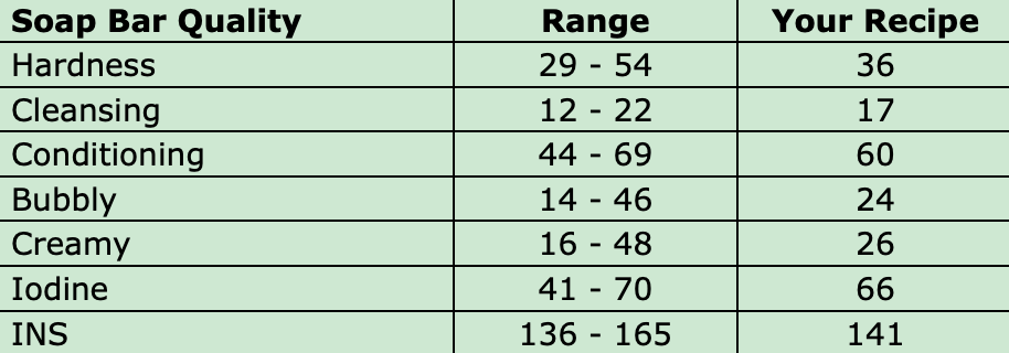Et je vous propose aussi un récapitulatif en image des différentes valeurs recommandées telles que proposées par SoapCalc: