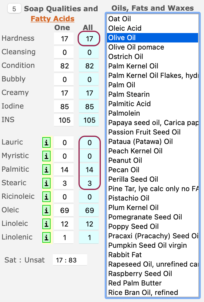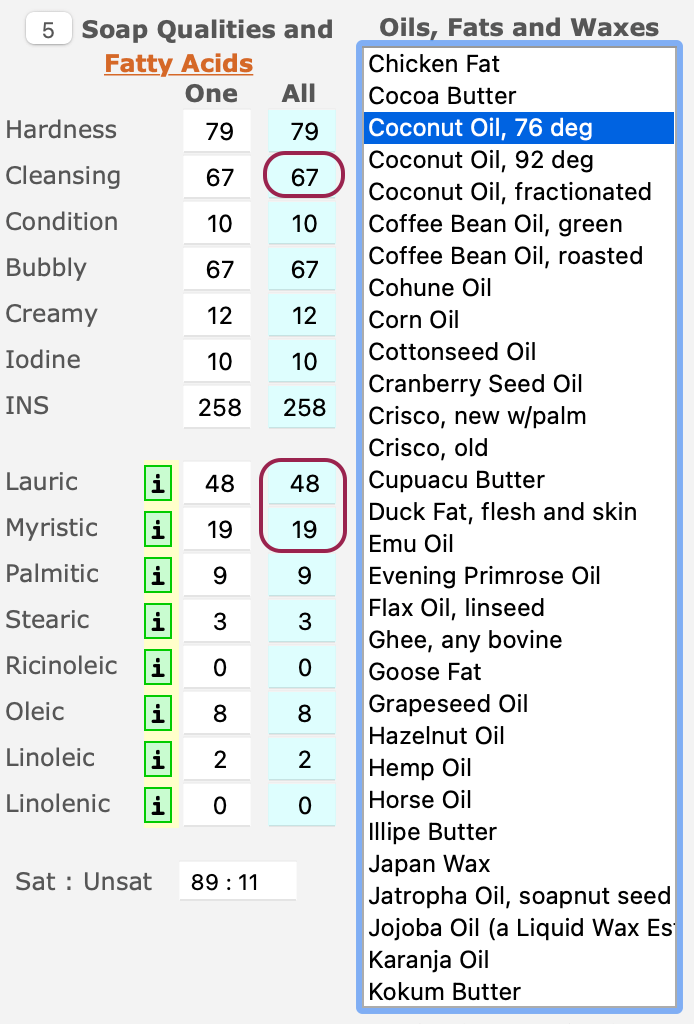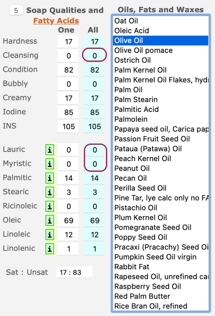 La remarque concernant l’huile de ricin du point précédent s’impose aussi. Sans acide palmitique ou stéarique, SoapCalc donnera un indice élevé de par la présence de l’acide ricinoléique mais la mousse produite ne sera pas aussi crémeuse que celle à laquelle vous pourriez vous attendre. Et ici aussi, le calcul ne devrait-il pas se faire sans l’acide ricinoléique?…