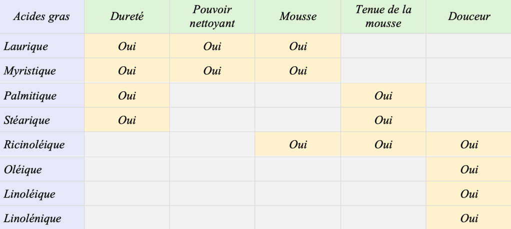 Avant de les passer au peigne fin, il est utile de se remémorer les propriétés apportées par les différents acides gras, ce qui nous permettra de mieux comprendre comment sont calculés ces différents indices.