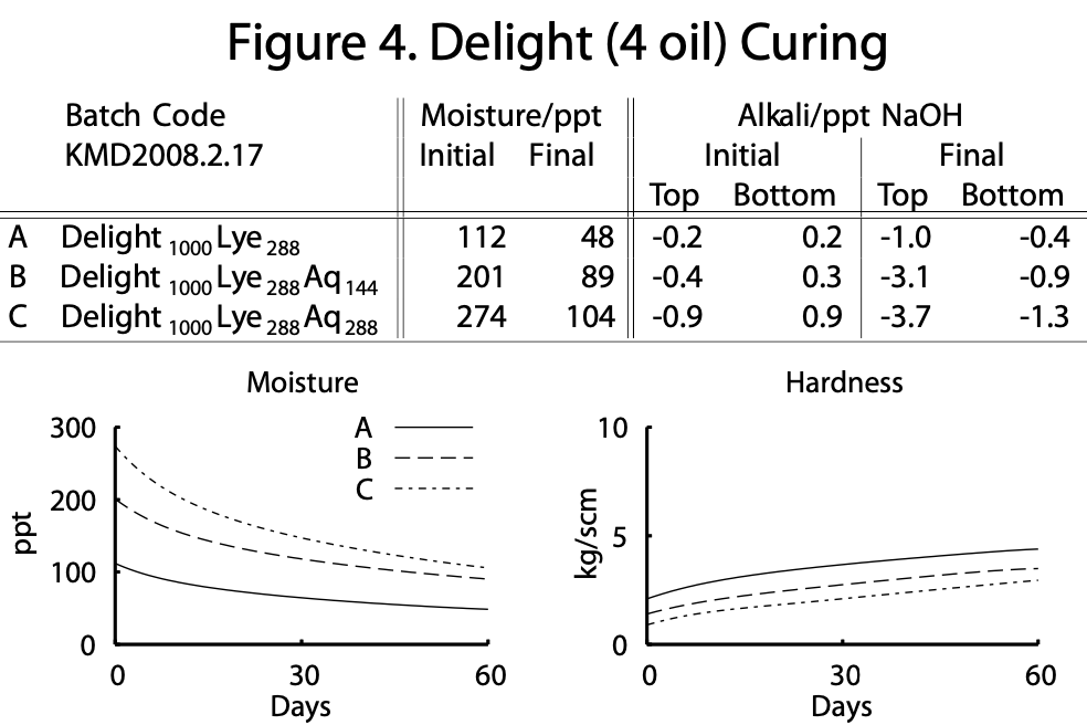 Si vous avez déjà parcouru le blog, vous aurez probablement remarqué que je fais souvent référence à un article du Dr Kevin M. Dunn traitant de la réduction d’eau (« Water Discount ») et ici encore, je ne vais pas déroger à la règle… Riches en enseignement, les expériences menées au départ de quatre formulations avec des concentrations de lessive de soude de 50, 33,33 et 25% nous montrent entre autres l’évolution de la teneur en eau des différents lots réalisés.