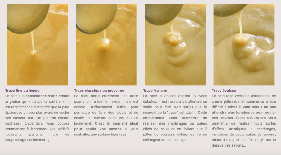Quoi que subjective, voici un bon résumé des différents stades tiré du dossier sur la saponification à froid consultable via ce lien sur le site d’Aroma-Zone.