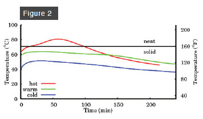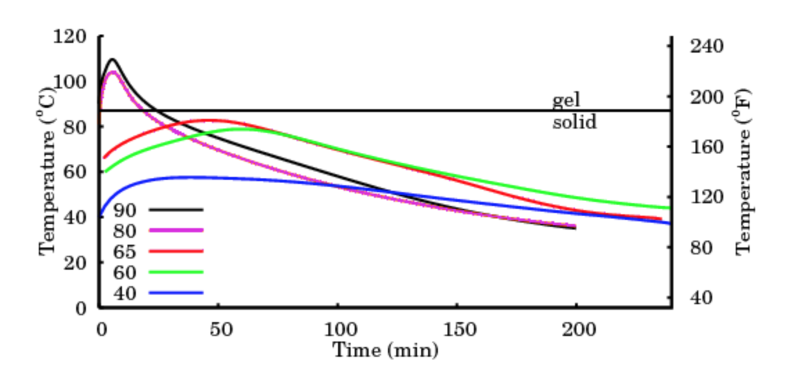 Suite à une expérience menée sur un mélange standard de corps gras composé de 39% d’huile d’olive, 28% d’huile de coco, 28% d’huile de palme et 5% d’huile de ricin auquel a été ajouté une lessive de soude à température ambiante à une concentration de 50%, 33,33% ou 25% amenant le mélange à une température de départ de 40°C (104°F), 60°C (140°F) et 70°C (158°F), il ressort d’une part que la diminution de la concentration de la lessive de soude abaisse la température de passage en phase de gel (représentée par la ligne noire sur les graphiques ci-après) et d’autre part que son obtention est conditionnée par la température de départ du mélange.