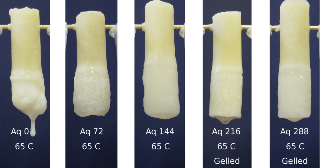 La bonne nouvelle, c’est qu’elle n’est pas nécessaire au bon déroulement de la saponification et n’a pas d’influence sur les caractéristiques et propriétés du savon obtenu. Par contre, et c’est là que le sujet fâche, la phase de gel conduirait selon certain à un savon de « meilleure qualité » de par l’organisation d’une structure cristalline plus ordonnée qui en améliorerait la tenue à l’usage… Faut avouer qu’il y a de quoi y perdre son latin d’autant plus que cette affirmation n’est pas corroborée par le Dr Kevin M. Dunn et je le cite: « Un savon gélifié n’est ni meilleur ni pire que le savon non gélifié mais il est subtilement différent dans ses propriétés d’absorption d’eau »…