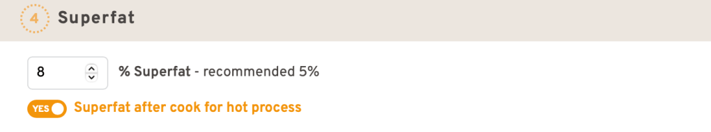 Comme sur Soapee, en activant « Superfat after cook for hot process », lors de la réalisation d’un savon saponifié à chaud, la quantité de corps gras à rajouter en surgraissage vous sera donnée en fonction du taux choisi, le calcul de la soude étant lui effectué sur un taux de surgraissage de 0%.