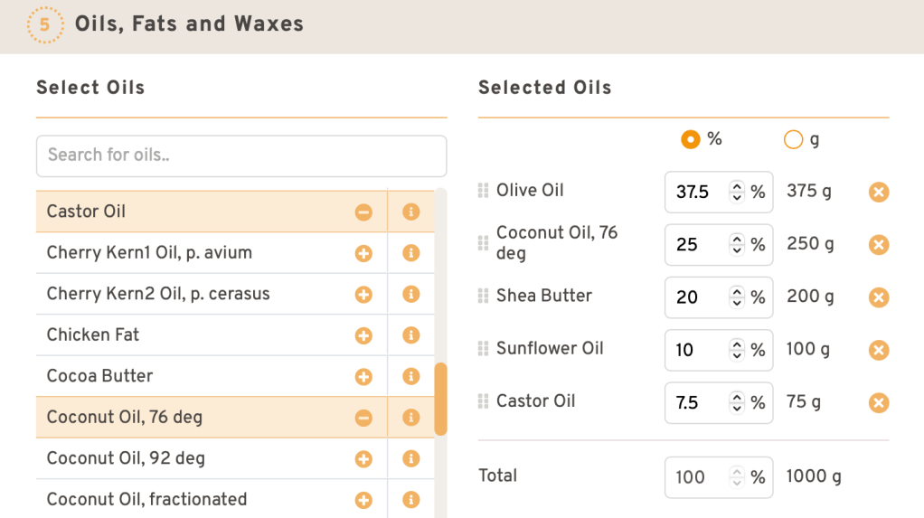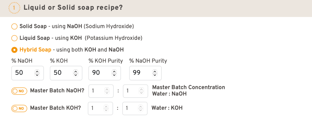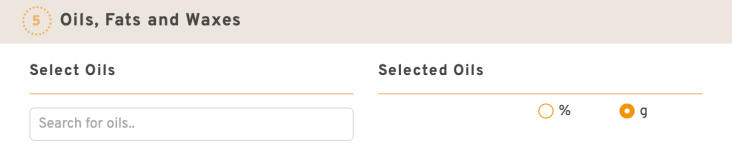 Le choix est pareil que sur SoapCalc quoique la préférence ne semble pas être donnée au pourcentage en eau par rapport au poids total des corps gras.