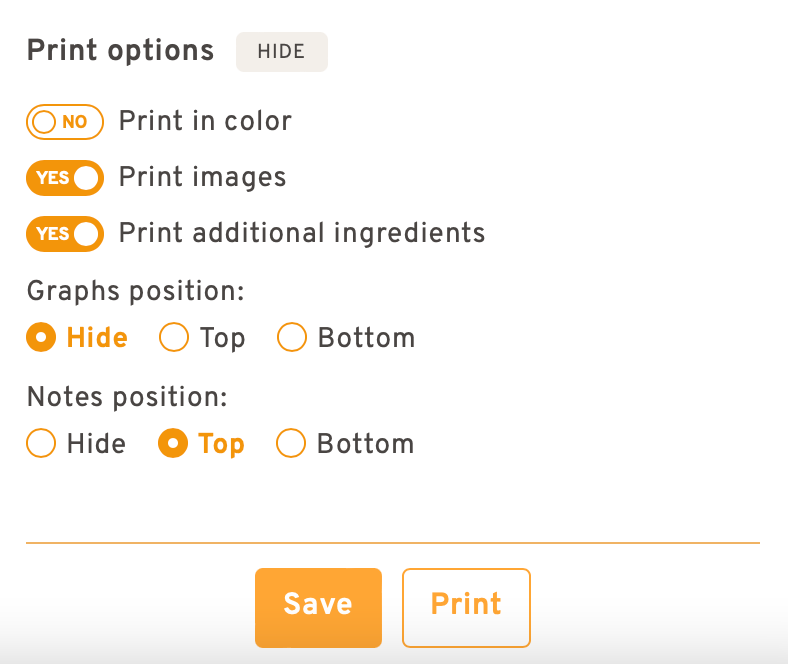 Il ne vous reste plus qu’à imprimer votre recette via « Print » avec la possibilité de choisir la mise en page en activant les options d’impression sous « SHOW » ou encore la sauvegarder via « Save » mais, qui bien entendu, sera soumise au mode de fonctionnement des cookies sur votre ordinateur.