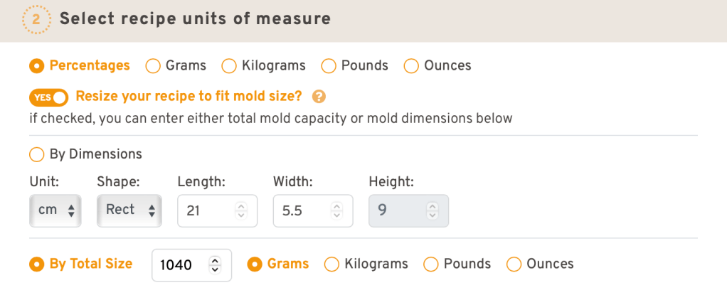 Comme sur Soapee, via « Resize your soap recipe to fit mold size? » (redimensionner votre recette de savon pour qu’elle s’adapte à la taille du moule), le calculateur permet d’adapter les quantités de votre formulation en fonction des dimensions de votre moule via « By Dimensions » ou de sa capacité utile exprimée en unité de poids si vous la connaissez via « By Total Size ».