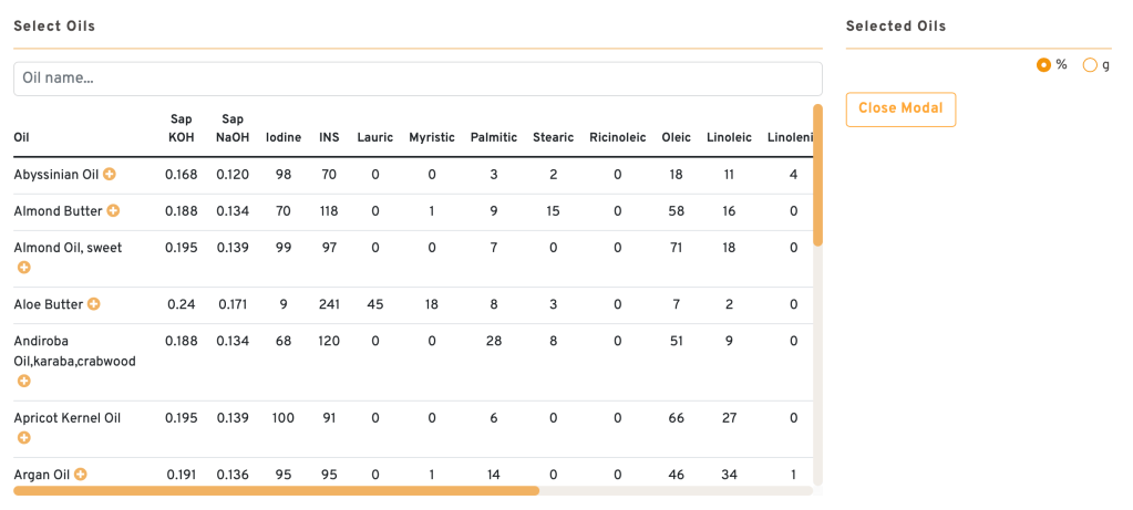 Même liste et schéma que SoapCalc, en survolant les points informatifs en orange, les données relatives à chaque corps gras apparaissent et précieuse aide à la formulation, via « Expand », il est possible d’avoir une vue d’ensemble de toutes ces données. Le retour à l’affichage classique se fait via « Close Modal ». La fonction peut par ailleurs être activée ou désactivée à l’infini en cours de formulation.